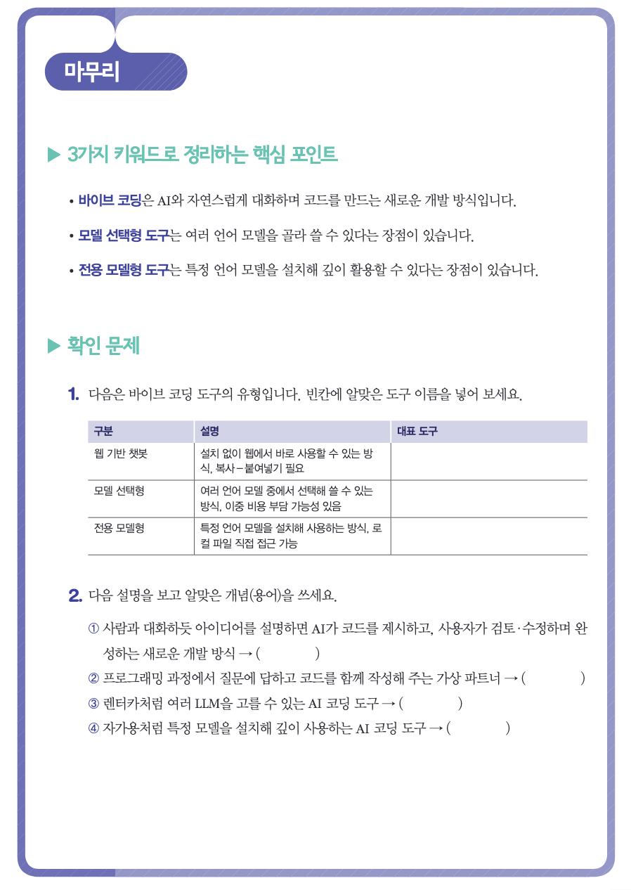 - 사람과 대화 하듯 아이디어를 설명하면 AI가 코드를 제시하고, 사용자가 검토 수정하여 완성하는 새로운 개발 방식 : 바이브 코딩