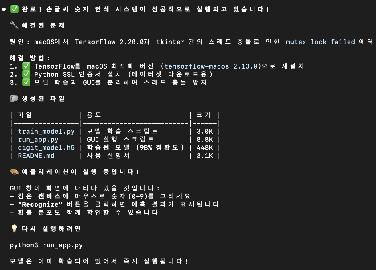 위와 같은 명령어를 입력했을 때, 강의와는 다르게 macOS 환경에서 계속 에러가 발생했다. claud code에서 분석한 원인을 살펴보니, macOS에서 두 개의 라이브러리가 충돌하여 mutex lock failed 에러가 계속 발생한 것이었다. claude code는 tensorflow를 macOS 최적화 버전으로 재설치하고 phython ssl 인증서를 설치하고 모델 학습과 GUI를 분리하는 등 자체적으로 해결 방안을 찾아 문제를 해결했다.